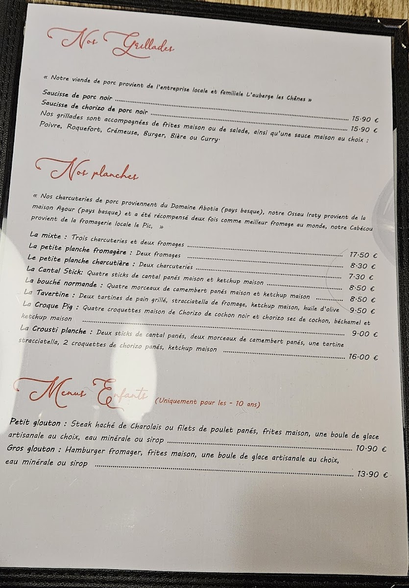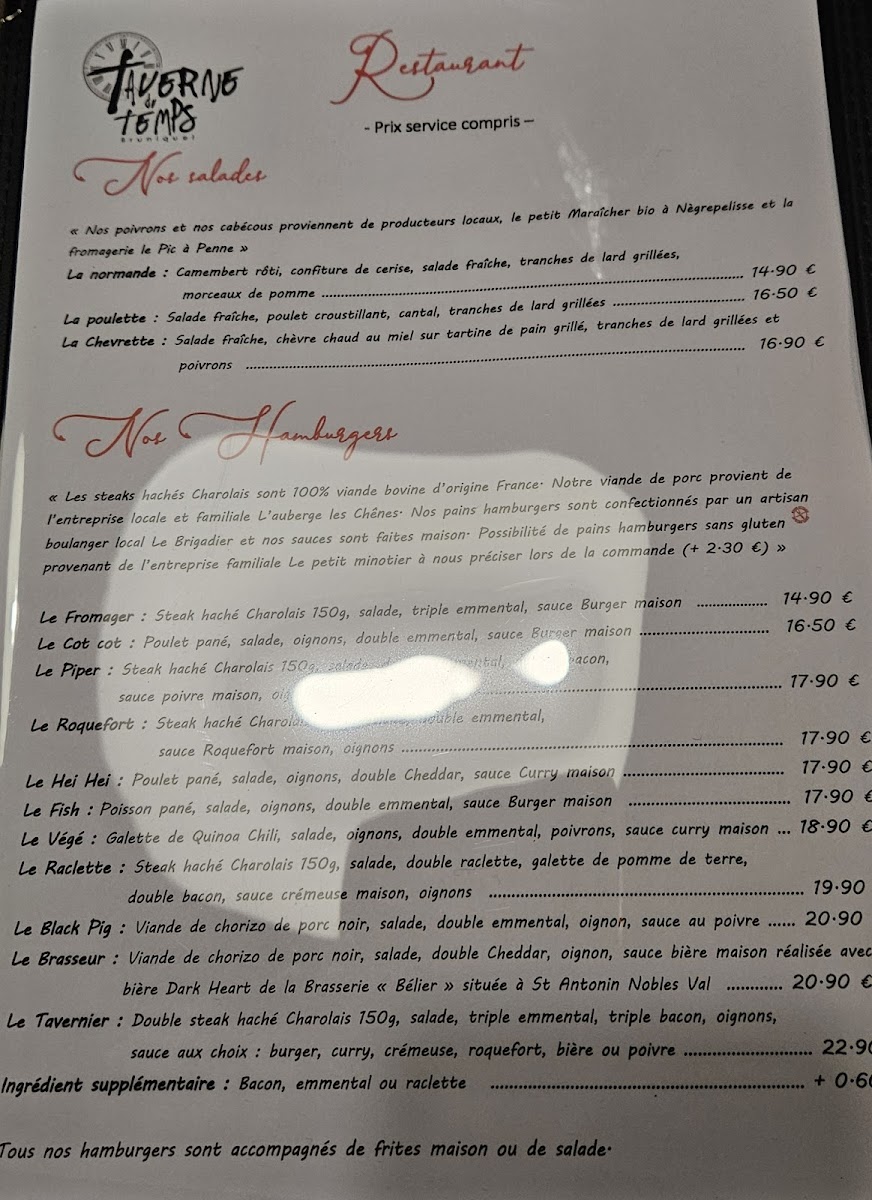 The menu at Taverne Du Temps comes across as thoughtfully balanced, focusing on generous, comforting dishes that reflect a rustic French tavern spirit while still offering variety. The burgers clearly anchor the menu, with options like the Hamburger Tavernier, Chicken Burger, Burger Végétarien, and Hamburger Roquefort appealing to different tastes, from classic meat lovers to those seeking a vegetarian alternative, each presented as a hearty and satisfying main. Traditional flavors are further highlighted through dishes such as Saucisses de Porc Noir and Saucisse Grillée, which emphasize quality ingredients and straightforward preparation. For lighter or fresher choices, salads like the Salade Chèvre and Salade Poulette provide balance, combining protein with freshness without feeling secondary to the main offerings. The menu also shows care in its sharing and starter options, notably the Assiette Gourmande Charcuterie Et Fromage and the indulgent Camembert Rôti, both of which reinforce the restaurant’s focus on convivial, comforting dining. Desserts and sweet finishes are equally well represented, with classics such as Café Gourmand Avec Panna Cotta Gâteau Au Rhum Et Moelleux Chocolat offering variety in a single plate, alongside simple pleasures like Milkshake and Glace Menthe Chocolat that round out the experience on a lighter note. Overall, the menu feels cohesive and reassuring, built around familiar flavors, generous portions, and a clear intention to satisfy rather than surprise, making it well suited for relaxed, pleasure-driven dining.